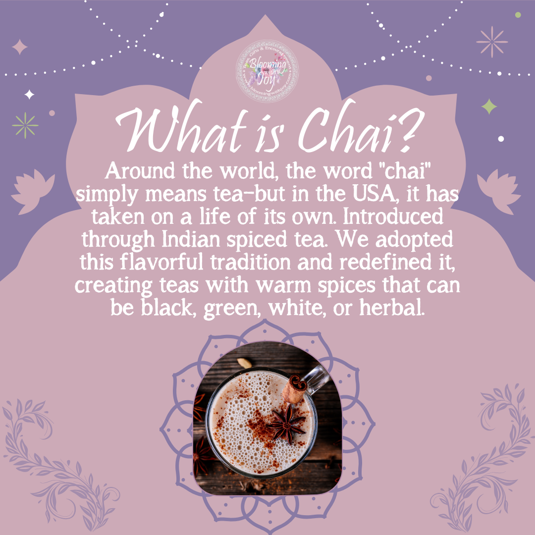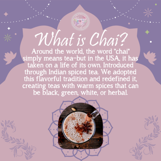 - Ingredients: Black Tea, Orange, Cinnamon, Ginger, Cardamom, Cloves, and Natural Spice Flavor