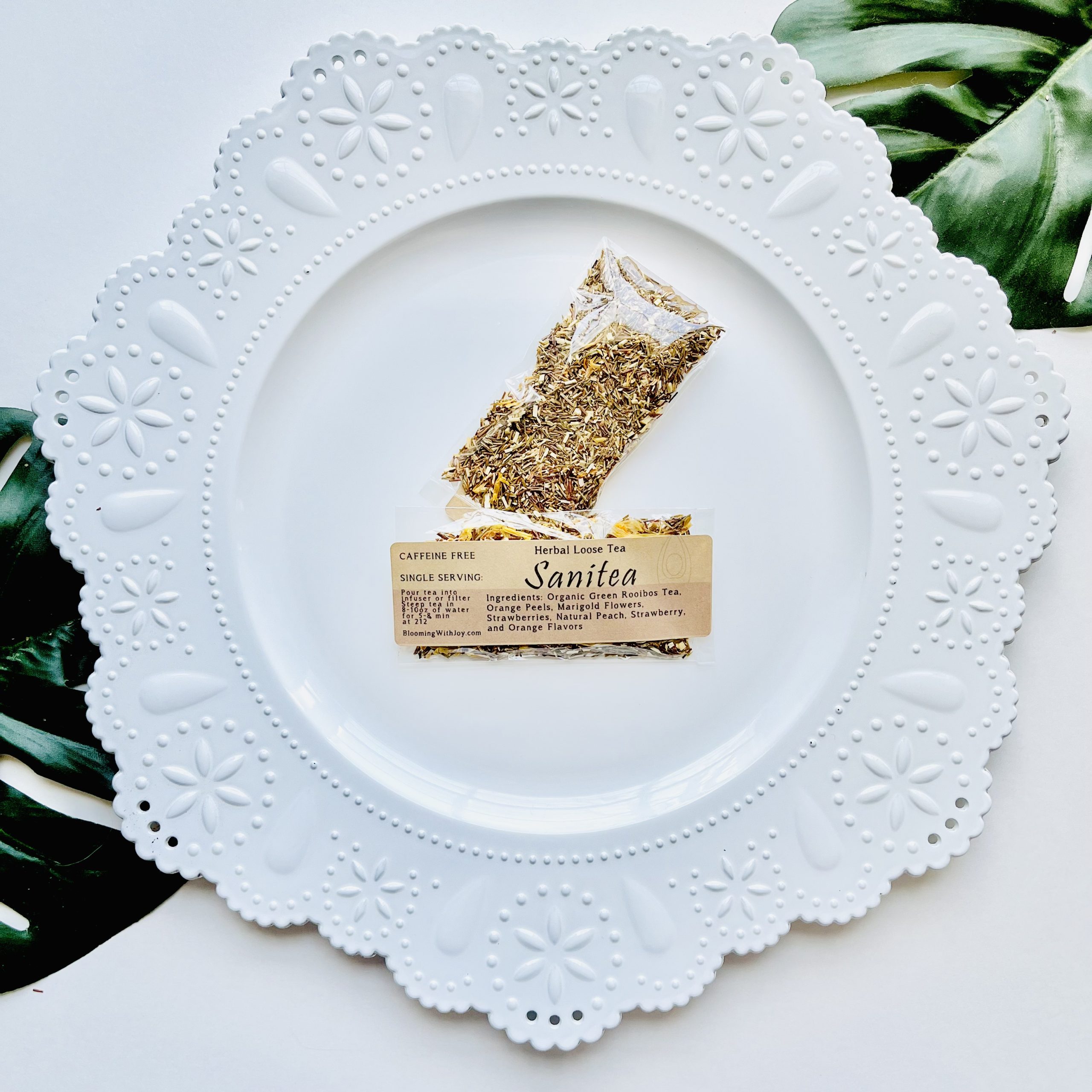 SaniTea is more than just a beverage – it’s a calming ritual designed to envelop your senses in comfort and tranquility. Our herbal blend features organic Green Rooibos Tea, known for its energizing properties, alongside delicate notes of orange peels, marigold flowers, and strawberries, all infused with natural peach, strawberry, and orange flavors. Each sip is a journey to serenity, allowing you to savor the sweet aroma and indulge in moments of bliss.