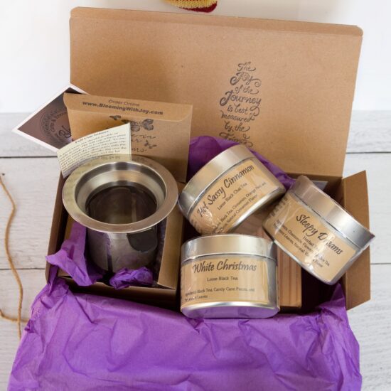Personalize your gift further by specifying the 3 tea tins of your choice in the message section of the shopping cart during checkout. Alternatively, if left blank, we’ll include a selection of our best-selling teas for you. If you’re shipping directly to the tea lover, feel free to include a personalized message in the checkout box or email us at michelle@bloomingwithjoy.com.