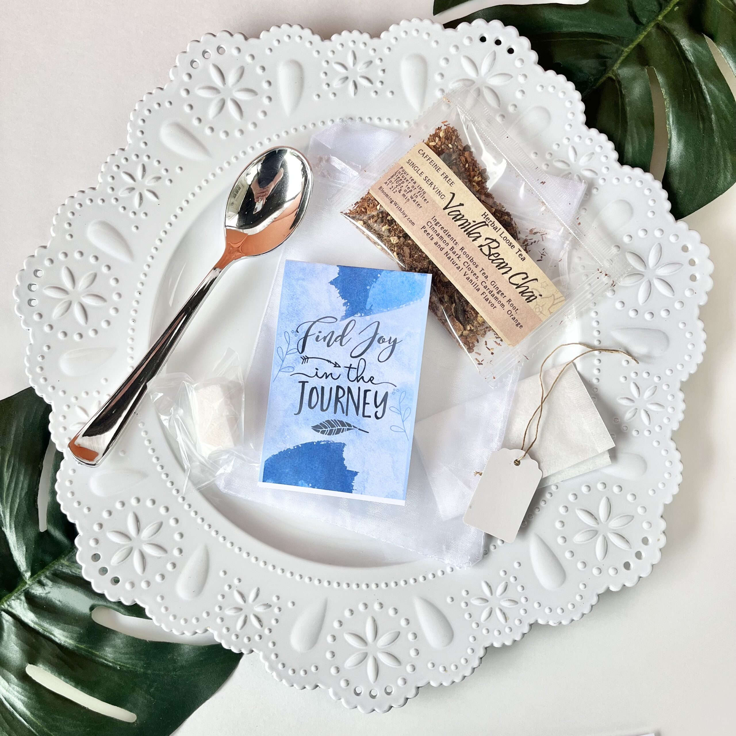 A sweet little tea moment wrapped up and ready to share! Our βFind Joy in the Journeyβ Tea Party Favor is a delightful way to spread warmth, encouragement, and a cozy cup of tea. With a serene watercolor blue design, this favor is perfect for weddings, bridal showers, baby showers, church events, corporate gifts, or just because!